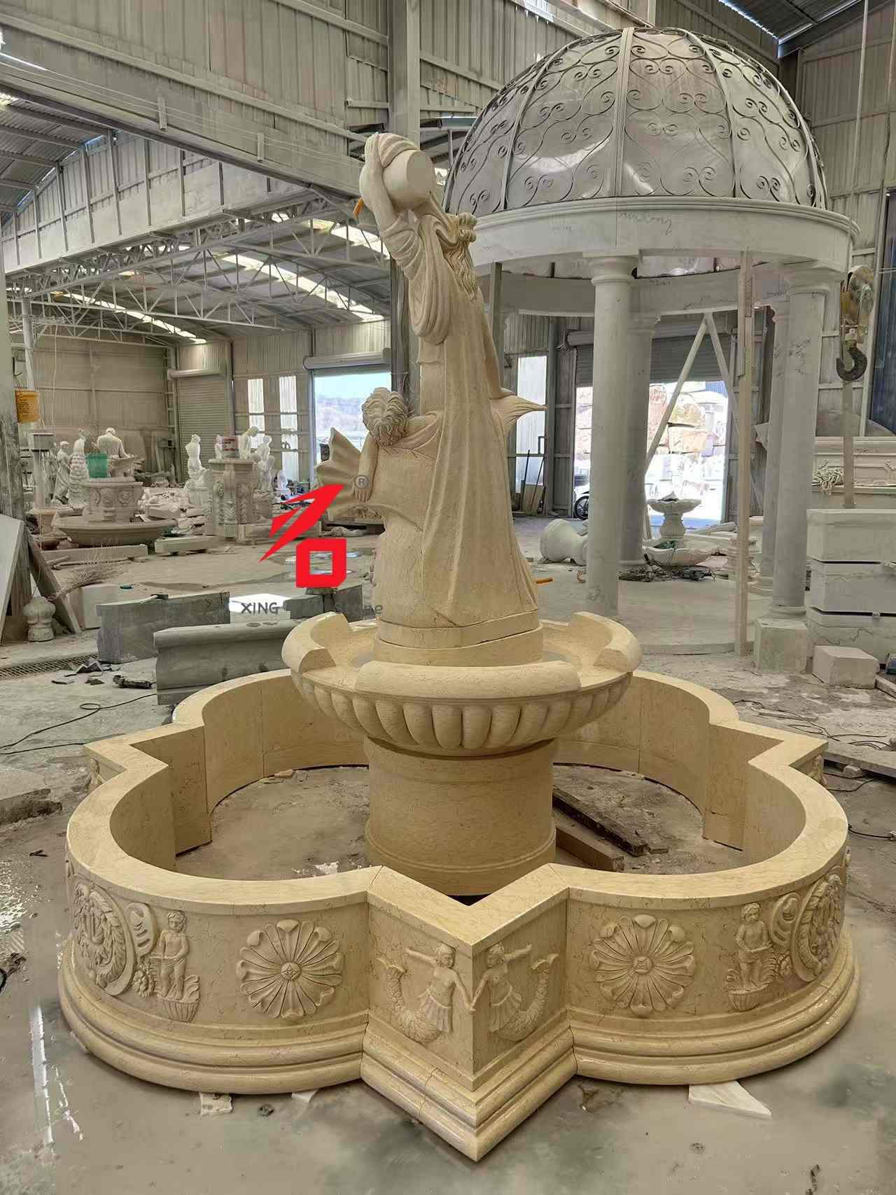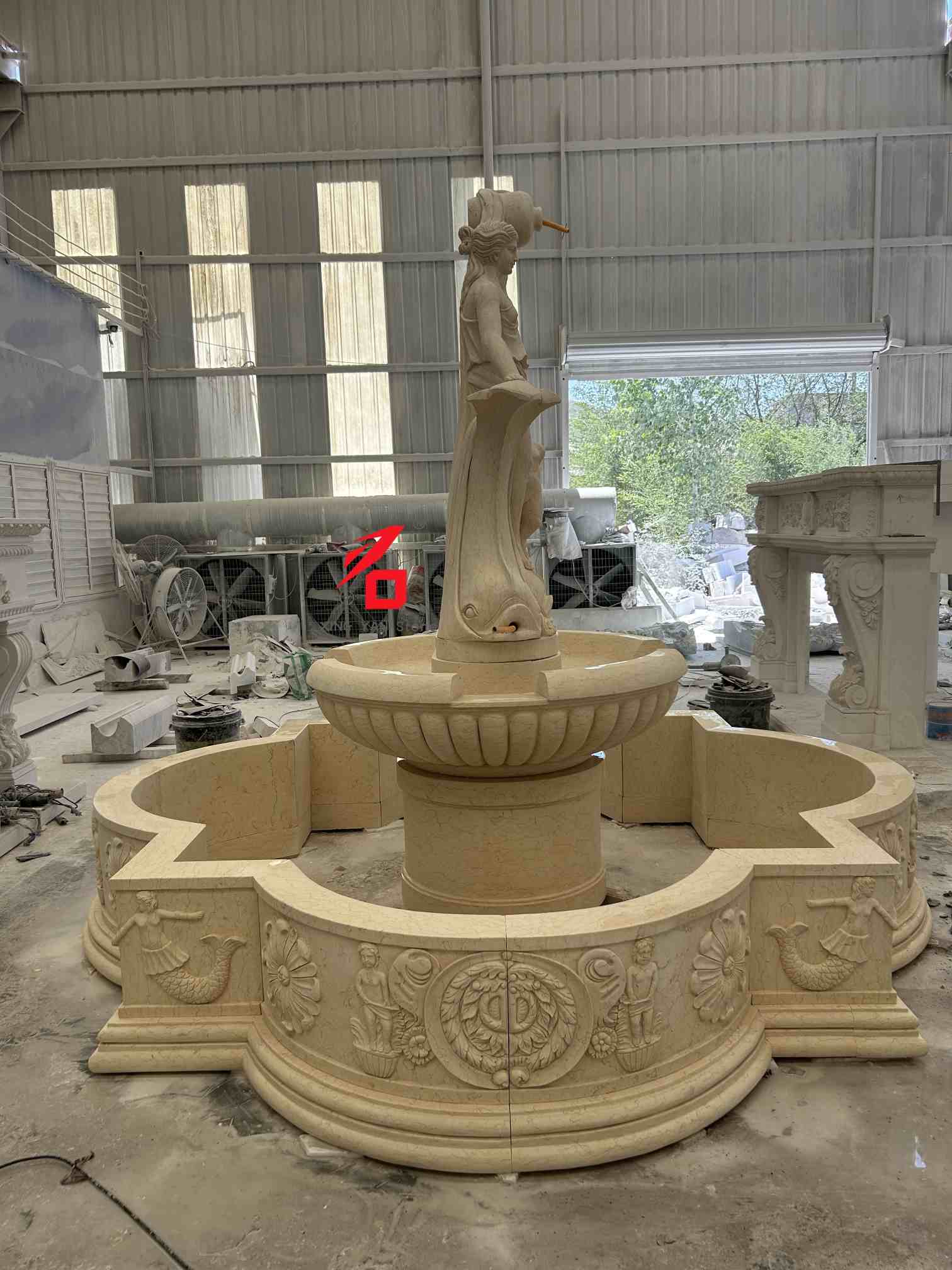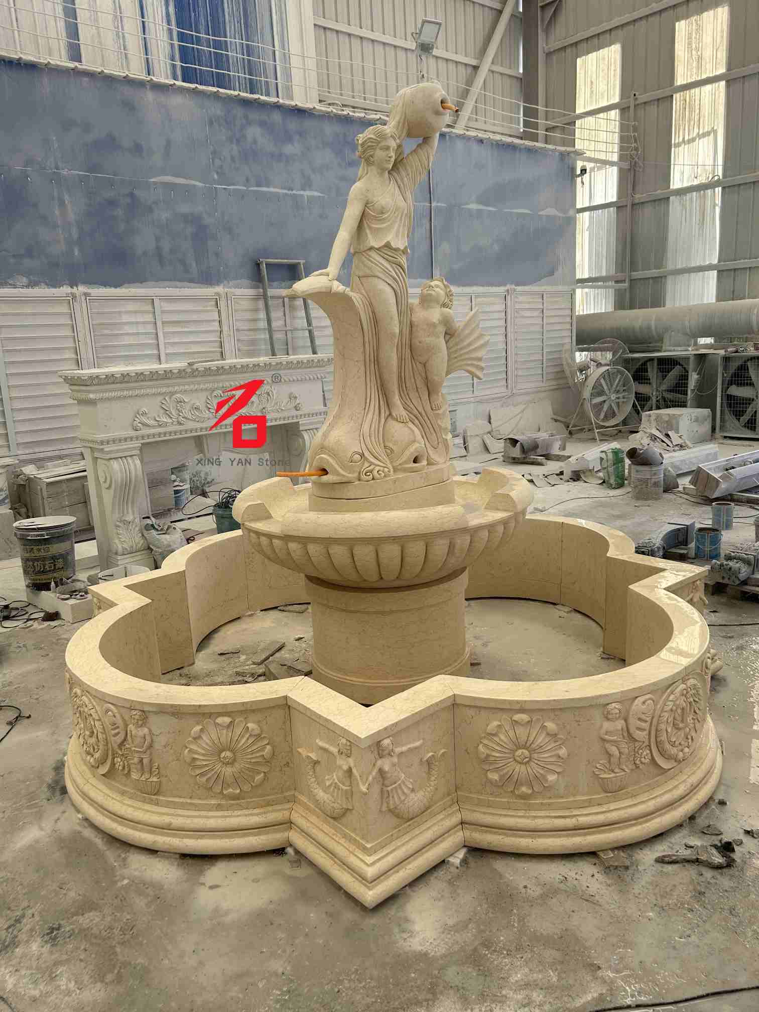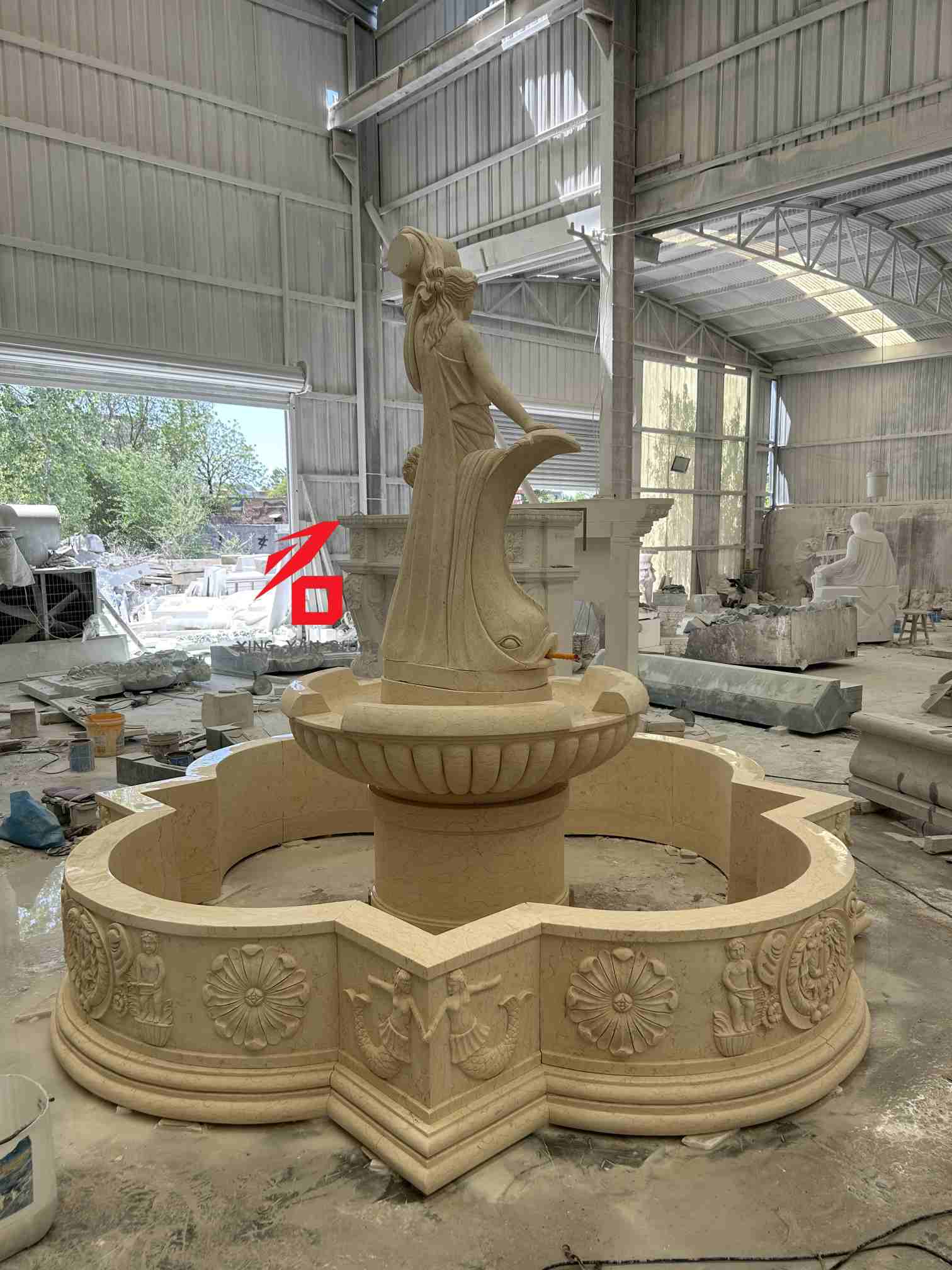 రాతి ఎంపికలు: కస్టమ్ స్టోన్ ఎంపికలలో లేత గోధుమరంగు మార్బుల్, వైట్ మార్బుల్, ఇసుకరాయి మరియు ఇతర సహజ రాళ్ళు ఉన్నాయి. రాయి యొక్క చక్కటి ఆకృతి, వెచ్చని రంగు మరియు బలమైన వాతావరణ నిరోధకత దీర్ఘకాల బాహ్య వినియోగం కోసం ఫౌంటెన్ యొక్క మన్నిక మరియు సౌందర్య ఆకర్షణను నిర్ధారిస్తుంది. చెక్కడం హస్తకళ: సాంప్రదాయ చేతితో చెక్కే పద్ధతులను ఉపయోగించి, అనుభవజ్ఞులైన శిల్పులు దేవత యొక్క ముఖ కవళికలు మరియు బట్టల నుండి పిల్లల మరియు చేపల ఆకారపు ఆభరణాల వరకు, యూరోపియన్ శాస్త్రీయ శిల్పం యొక్క కళాత్మక ఆకృతిని మరియు త్రిమితీయతను ప్రదర్శిస్తారు.