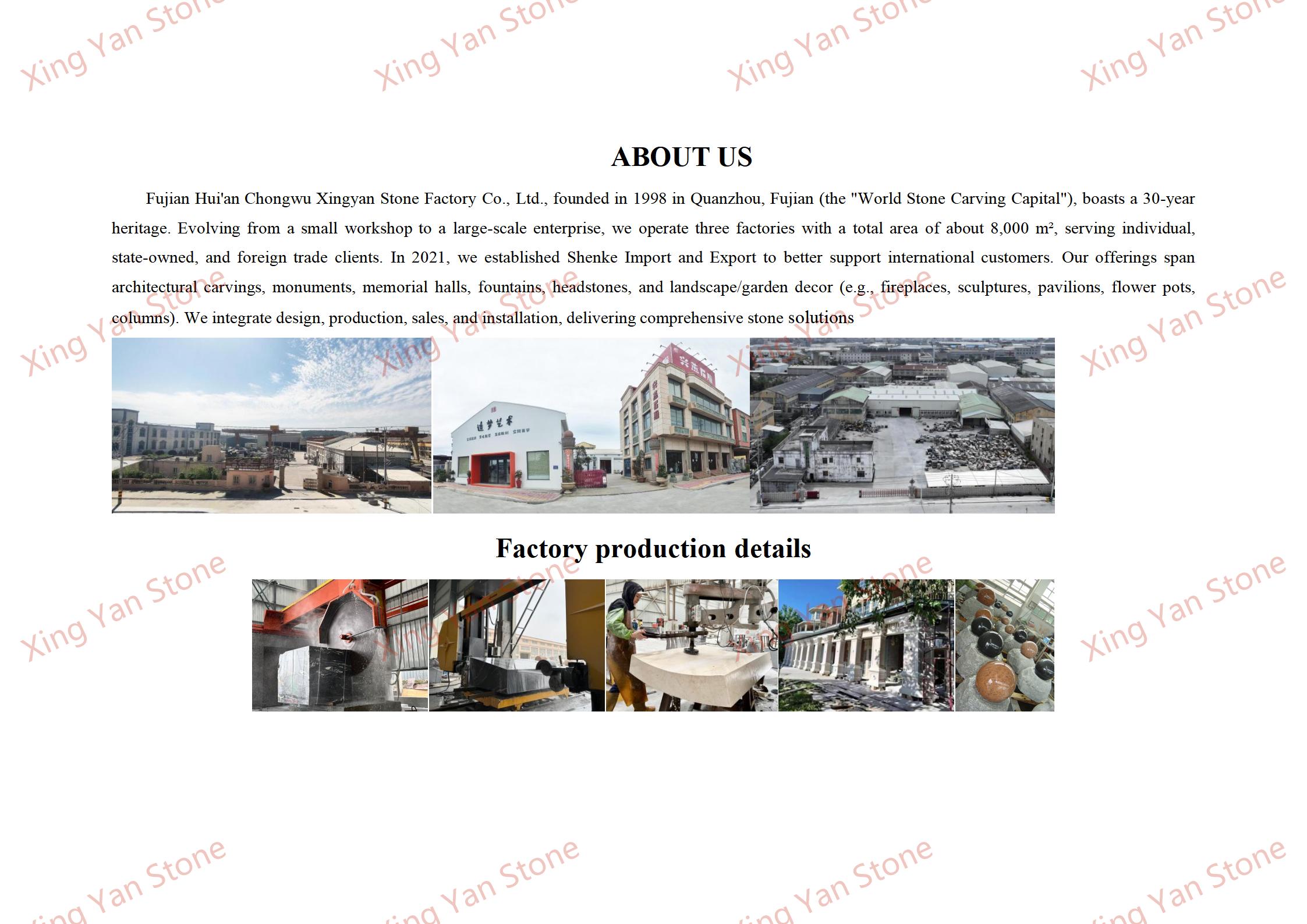 అనుకూలీకరణ సేవలు: విగ్రహం యొక్క పరిమాణం మరియు సామగ్రి అవసరాలకు అనుగుణంగా సర్దుబాటు చేయబడతాయి (ఉదా., ఇతర గ్రానైట్ రకాలుగా మారడం), మరియు టెక్స్ట్ చెక్కడం (ఉదా. పేరు, స్మారక సందేశం) మద్దతు;